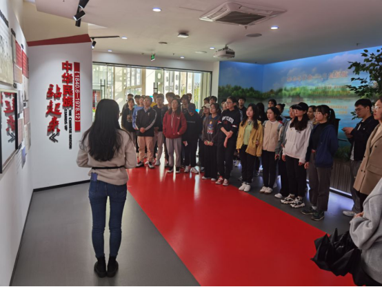 进入宜秀党建馆,同学们跟随讲解员的步伐,了解馆内的各项设施及其呈现的历史。战争模拟演示厅内,声光影的现代手段让同学们身临其境。视觉上的感受和讲解员的解说结合,使同学们感受到中国共产党史、新中国史、改革开放史和社会主义发展史在时间长河中纵合,新中国的面貌日新月异,新中国的发展奔腾不息。