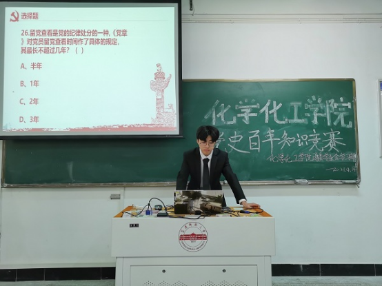 “1935年12月9日,在中国共产党领导下,在哪里首先爆发了大规模的学生抗日救亡爱国运动,这次运动史称一二九运动”,题目宣读完毕,“开始抢答”主持人发出抢答口令,选手们迅速作出反应,各班的抢答选手通过抢纸巾的方式获得优先答题权,比赛进入白热化阶段,各班参赛队伍积极踊跃,赛场气氛高涨,各队伍争锋相对,比分你追我赶。本次党史知识竞赛分为2019级、2020级两组对抗赛,共有16个班级参加,每班四名参赛队员,各派一位代表上台抢答,其余三名队员助力作答。2019级和2020级分别各自进行了三场小组赛和一场决赛,最终由2019级化学专业(3)班、2020级化学专业(3)班获得一等奖。