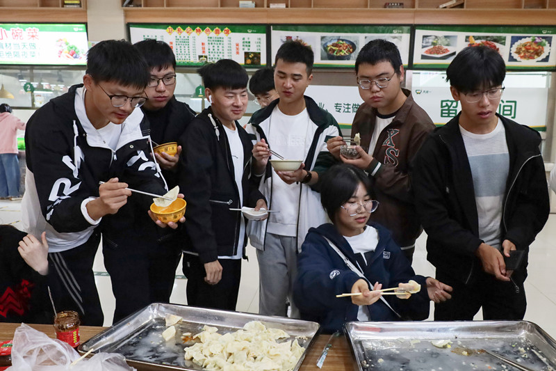 通过手把手教学,大家包饺子的速度逐渐加快,近1000只饺子进入蒸笼。饺子蒸好后,班级学生分工合作,迅速完成端盘、装盒、打包、派送工作。团支书汪宏亮等5名学生化身“外卖小哥”,手提饺子从西苑食堂赶往学校各个角落,打包送给学校值班的保安与保洁人员,感谢他们在疫情期间的默默付出。“希望在包饺子活动中拉近班级学生间的距离,让他们在劳动的同时收获自己动手制作美食的成就感。”该班班长黄顺表示。(文/学生记者 李婷 图/学生记者 高甜 审核:鲍青燕)