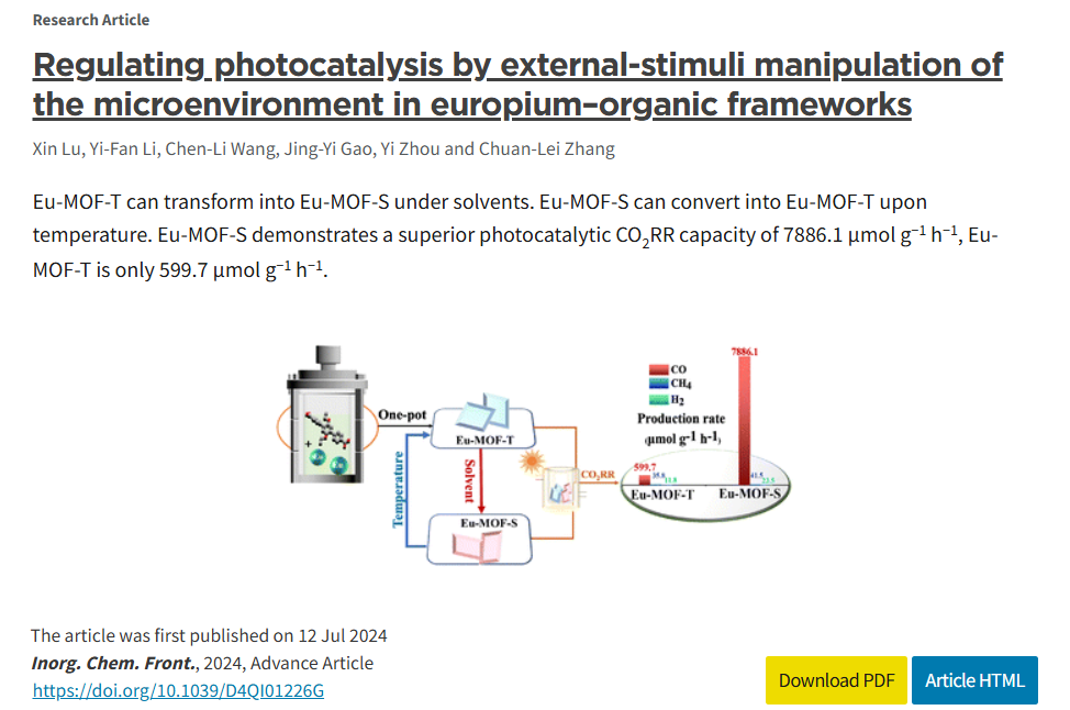 2021级化学专业研究生路新以第一作者在无机化学领域权威期刊《Inorganic Chemistry Frontiers》(化学大类一区,影响因子6.1)发表题为“Regulating Photocatalysis by External-Stimuli Manipulation of Microenvironment in Europium-Organic Frameworks”的论文,其指导教师张传磊为第一通讯作者,水果派解说