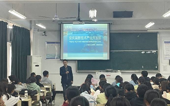 材料化学专业负责人武琳老师从提问引入专业介绍主题。她围绕材料化学专业简介、人才培养方案、专业师资力量以及该专业的就业与深造等四个方面进行阐述,通过创设日常生活情境、列举数字进行比较、讨论材料化学专业知识以及援引专业著名学者的相关介绍,对材料化学专业进行了全方位、多层次、立体化的介绍。化学工程与工艺专业负责人陈静娟老师从化学工程与工艺专业是什么、如何成为化学工程与工艺专业的专业人才、本专业就业与考研情况三个方面介绍了专业情况。化工新材料产业学院(研究院)常务副院长官叶斌老师分别向两个专业同学分析了安庆高新技术产业开发区战略定位、政策支撑以及区位优势,鼓励同学们不断提升专业本领,站上更好的“赛道起跑点”,留在高新区,留在安庆就业创业。