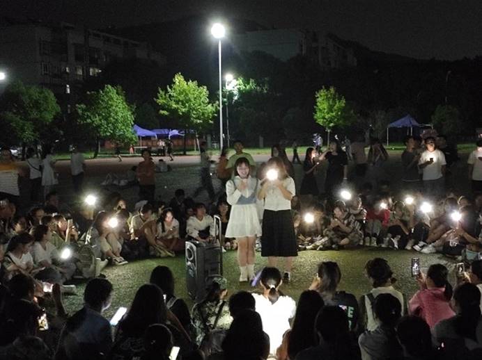 为增进新生之间相互了解,学院在操场上搭建了才艺表演舞台。2021级的新生们能歌善舞,在广阔之地展现着属于他们自己的青春与活力。随着歌曲《夜空中最亮的星》前奏的响起,学生们自发打开手机闪光灯,随着音乐轻轻晃动,沉浸在欢快愉悦的氛围当中。