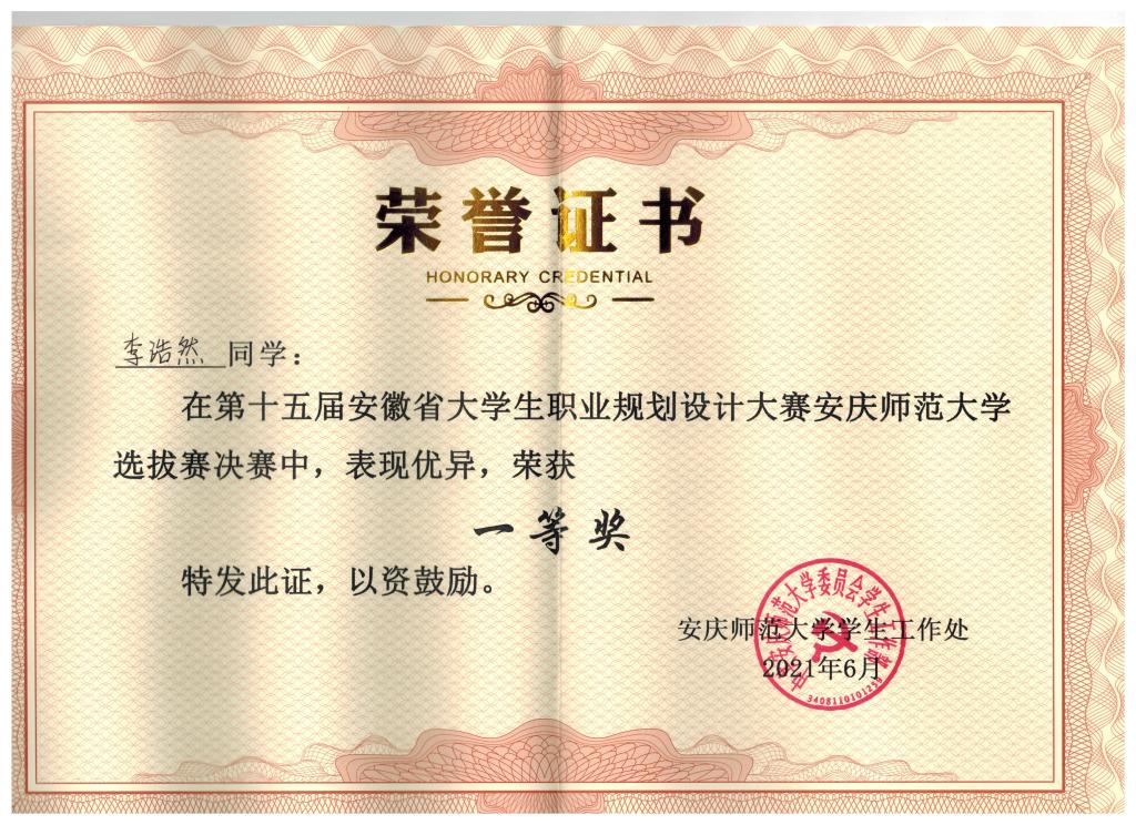 李浩然代表学院参赛并获得校赛一等奖。