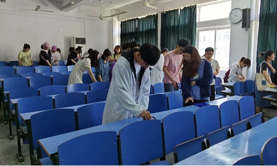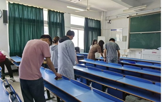 装满一壶自制的清洁剂,均匀地喷洒在桌面上,再用刷子清理污垢,最后用抹布轻轻擦拭。化学专业2019(2)班的戴志远完成自己的任务后,挂满汗水的脸颊也露出了微笑。“保持教室的清洁卫生是我们每个人的责任和义务,作为学生党员,我们更应以实际行动呼吁着大家一起行动起来,共建文明和谐的校园。”他说。