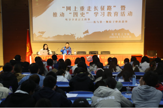 在文津楼111教室开展“网上重走长征路”暨“四史”学习教育活动,特邀曾参与中国第一颗原子弹基地建设工作的尹瑞世上士与人文学院郝佩林博士,讲解中国原子弹建设的相关历史。活动由18级化学专业辅导员王玲主持,吸引了近200名学生参加。