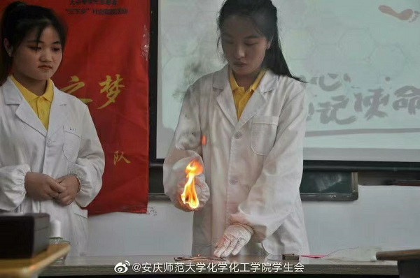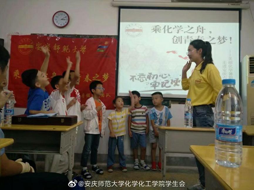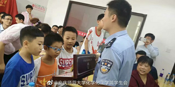 副院长王钧伟等有关负责同志的陪同下,前往慰问指导实践团队。安庆市青少年宫的校长罗跃进、部长祝贺和书记王桐怀参加此次活动。此外,实践团队还邀请到了安庆市公安局宜秀分局禁毒大队的李巢安警官来宣传一些与化学密不可分的毒品知识。