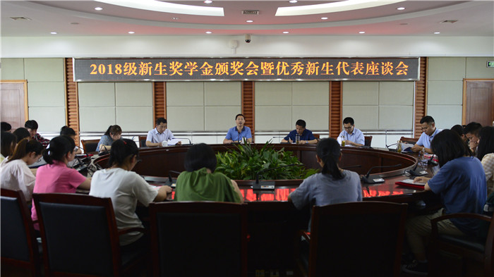 6月12日,学校召开2018级新生奖学金颁奖会暨优秀新生代表座谈会。副校长汪时珍出席会议并为获奖学生代表颁奖。校办公室、宣传部、学生处、财务处、教务处(招生办公室)等部门负责人、部分优秀新生奖学金获奖代表参加会议。校党委常委、教务处(招生办公室)处长苏本跃主持会议。