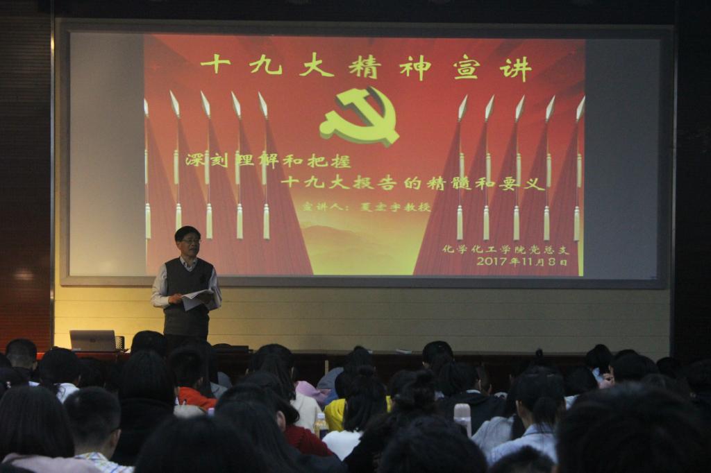 党总支在D楼111教室开展十九大精神宣讲活动。学院党总支书记夏宏宇作了题为《深刻理解和把握十九大报告的精髓和要义》的主题报告,全体学生党员和入党积极分子聆听了报告。