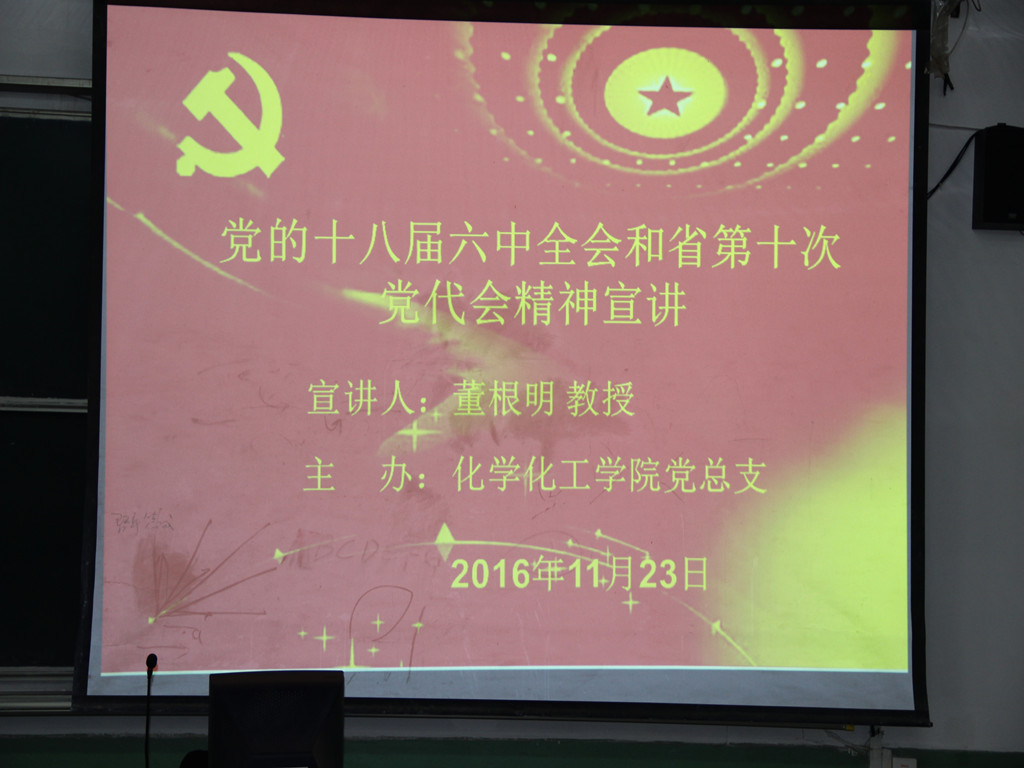 邀请学校图书馆馆长、教授董根明到学院进行党的十八届六中全会和省第十次党代会精神宣讲。宣讲会由学院党总支书记夏宏宇主持,学院全体教职工和学生党员参加。