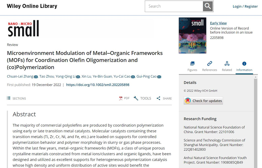 张传磊博士课题组在材料领域权威期刊Small (IF=15.153)上发表了题为《Microenvironment Modulation of Metal–Organic Frameworks (MOFs) for Coordination Olefin Oligomerization and (co)Polymerization》的综述性论文。这是水果派解说
