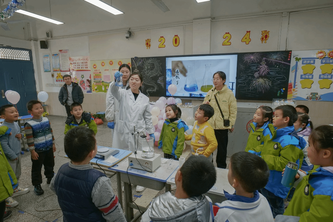 近日,大学生科技化学协会前往安庆市高琦小学开展趣味化学实验,为小学生带去一堂生动的科普互动体验课。